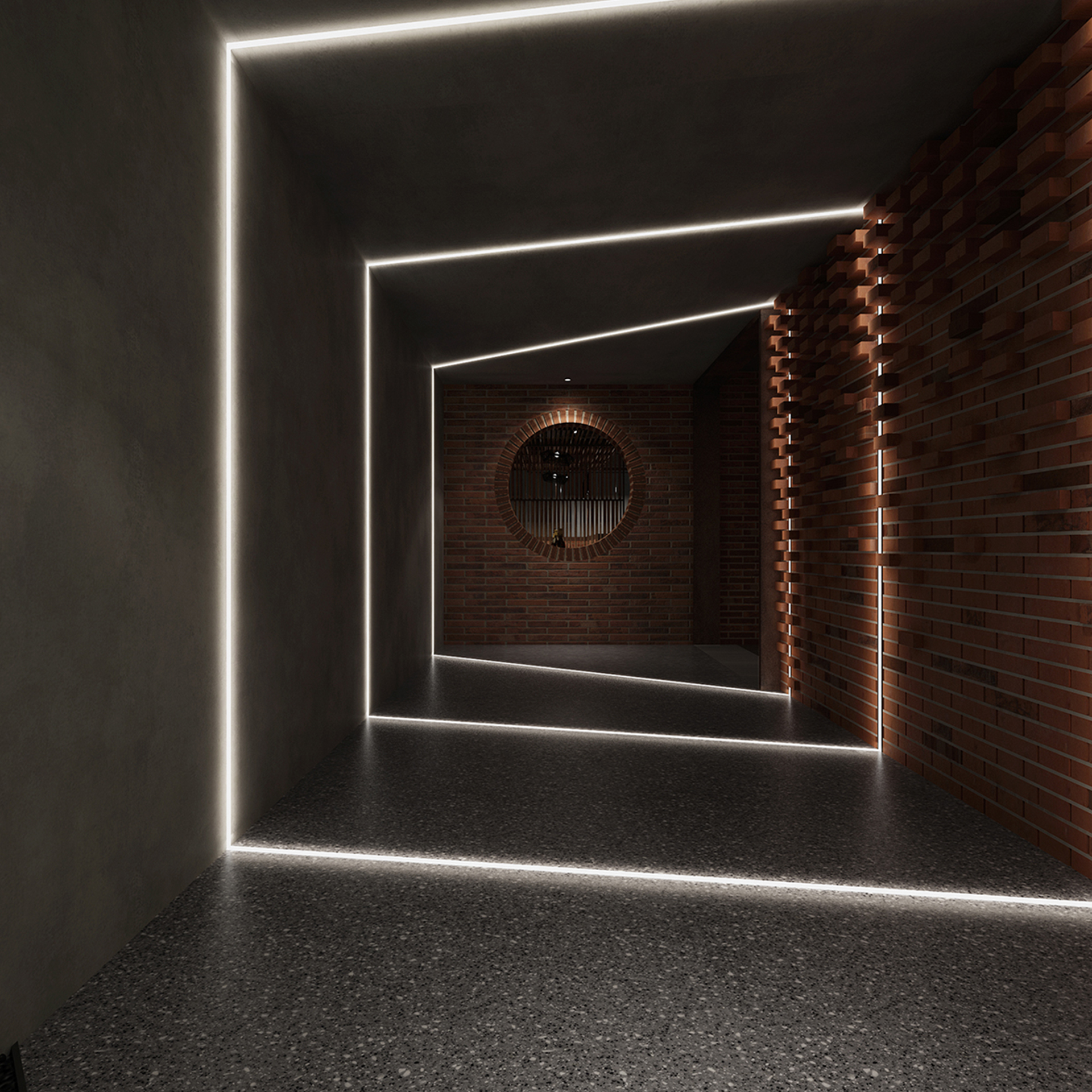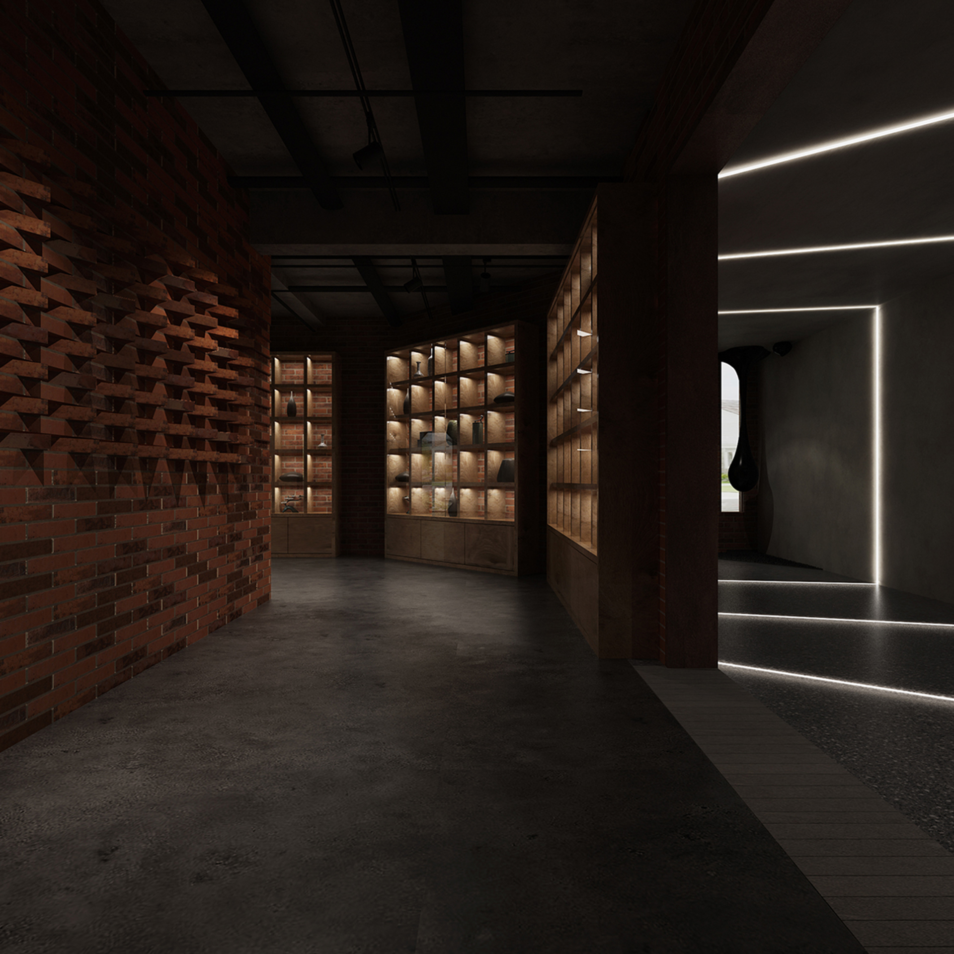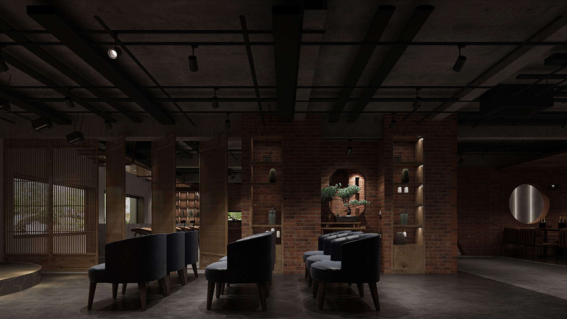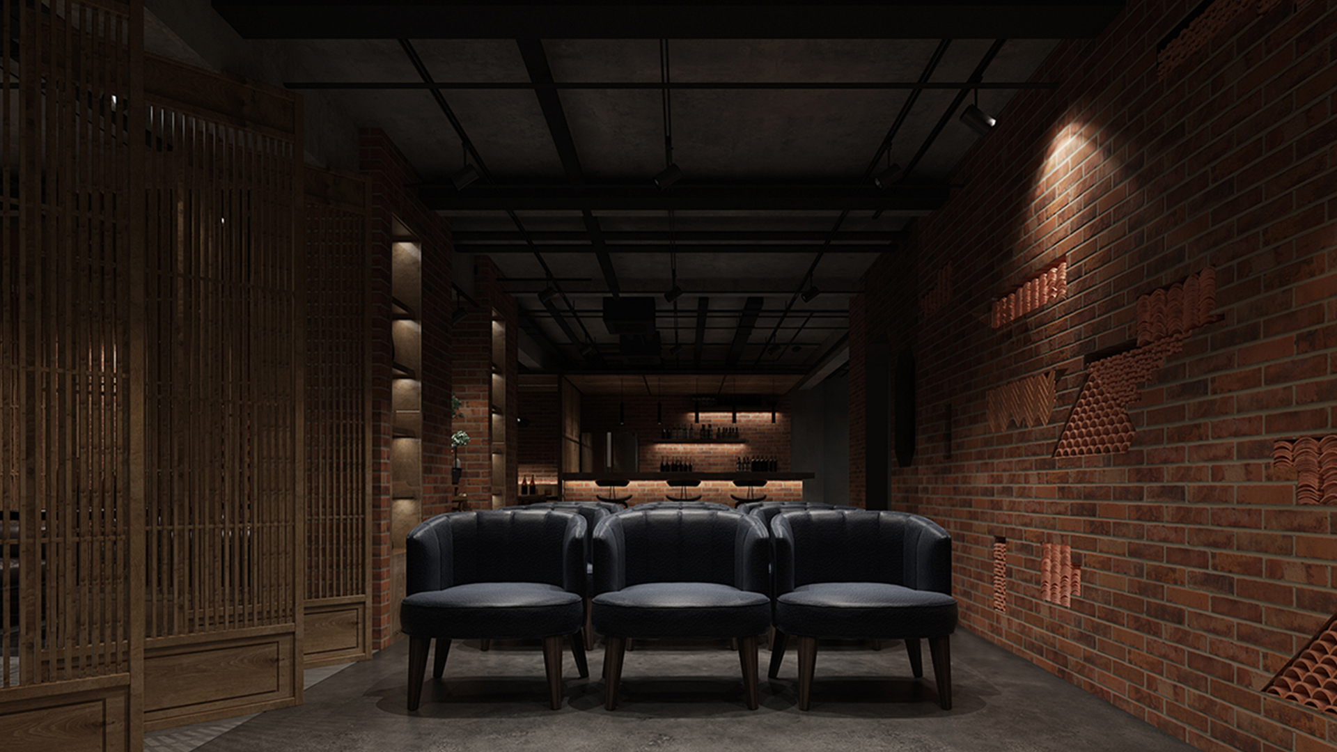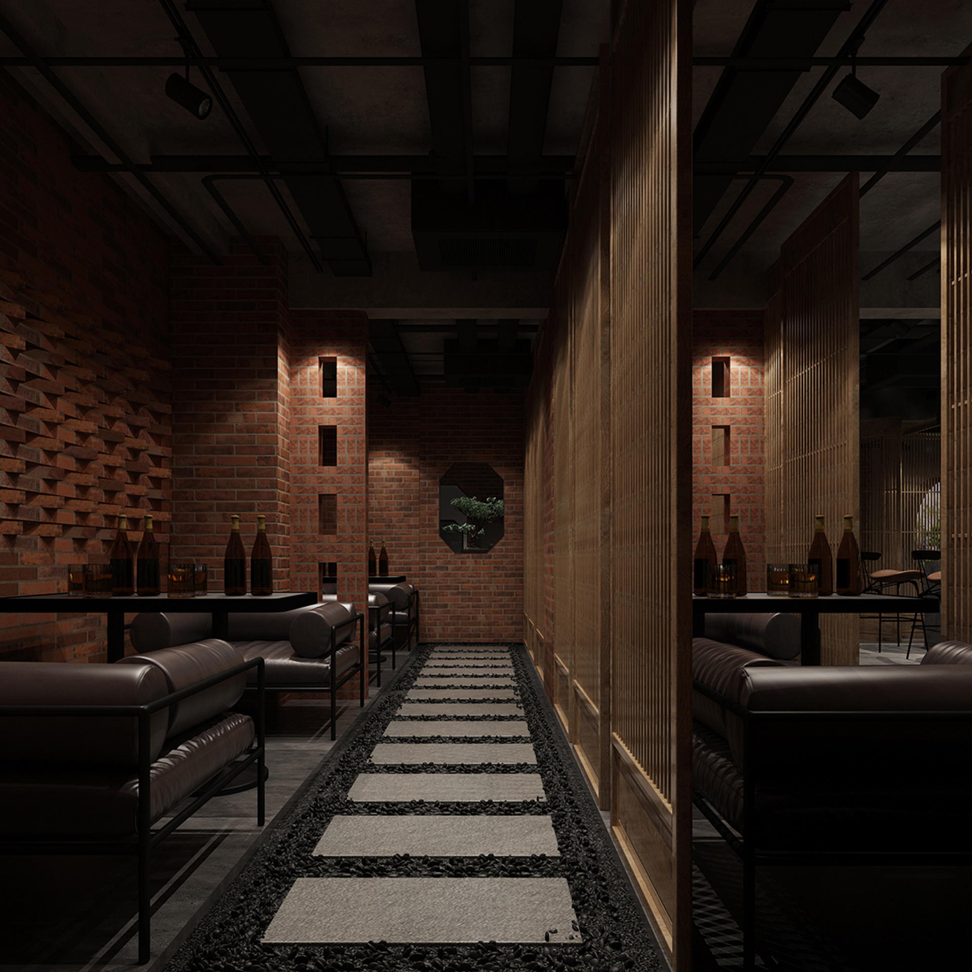 酒吧寬闊的通道讓吧臺、酒墻、沙發(fā)區(qū)分散開來,讓在不同區(qū)域活動的人在碩大的空間中找到自己的歸屬。光在整個空間中扮演著各種角色,有些讓人沉靜,有些讓人興奮。石墻、鵝卵石,最純粹的建筑元素在精心的排布和設(shè)計中發(fā)揮了其美的特點。墻面構(gòu)筑元素采用了泡沫紅陶瓷用來模擬紅磚材料,防水防火?;璋档沫h(huán)境下,人們才真正可以與世隔絕,享受自由。